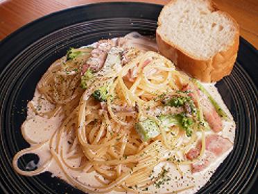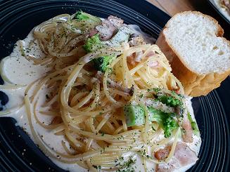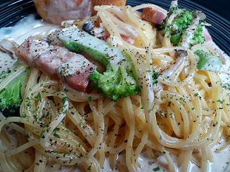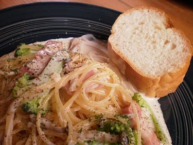 この日のパスタは、ベーコン、ブロッコリー、しめじのクリームソースパスタ。