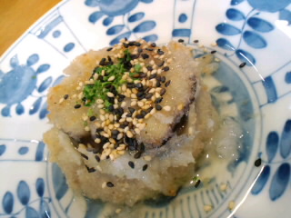 ひき肉がたっぷり挟まってて、揚げ出し風に仕上がってます。