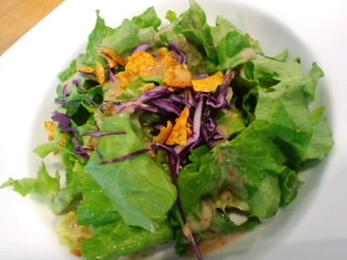具だくさんのコンソメスープと、ちょっぴりマスタードが効いてる(?)ドレッシングのサラダ。