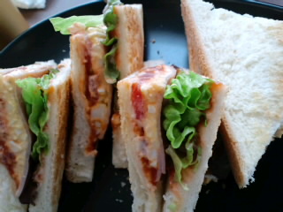 卵、トマト、ハム、レタスが挟まれたミックスサンド。