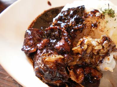 (黒糖やココアを加えコクのある黒いソースに仕上げたカレー)