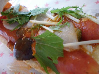 そしてその上にはピクルスのかわりに大根の甘酢と、水菜。