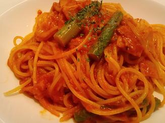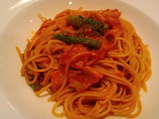 こちらが「柚子こしょうのトマトソースパスタ(ベーコン&アスパラ)」