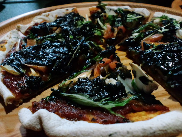 ピザは2種類あって、チーズのピザに、黒いピザはなんと!黒ゴマですよ