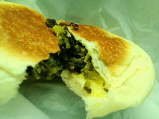 外はもちもち、中の野沢菜が薄味ですが、変にのどが乾かないちょうど良い味です。