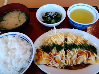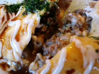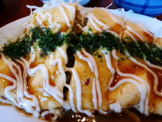 玉子焼きのようなものに、お好み焼きのソースとマヨネーズと青のり。