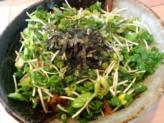 たっぷりのねぎ、小さく刻まれた貝割れ大根、刻み海苔、